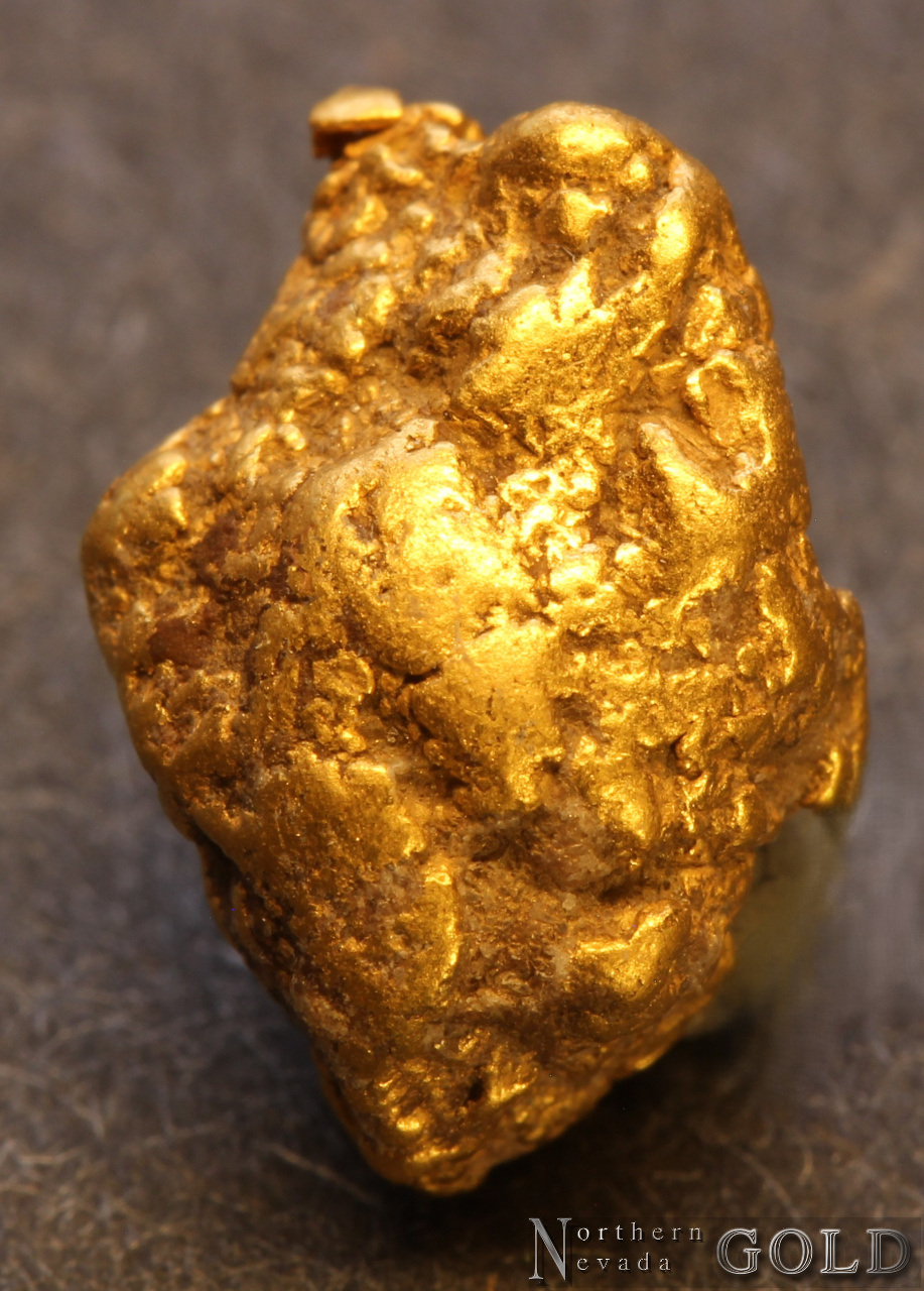 A lovely Gold nugget from the Manhattan Gulch Placers in Nye Co. NV.  Strong brassy-yellow color and bright, velvety luster. Approximately 8% Quartz matrix. Curious texture. Found with a metal detector. Weighs 2.3 Grams.