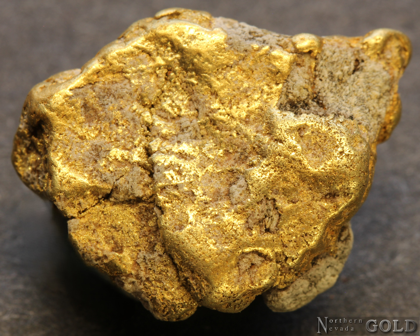 A medium sized Gold nugget from the Manhattan Gulch Placers in Nye Co. NV.  Strong brassy-yellow color and very bright and vibrant luster. Well water-worn. Matrix is a white Quartz. Weighs 8.32 Grams