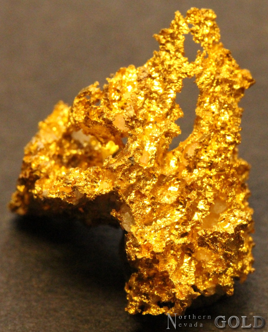 A stunning, crystalline Gold specimen from the Round Mountain Mine in the Round Mountain Mining District.  Arborescent Gold shows brilliant luster and a nice deep orangish- yellow color. Skeletal texture. A few % Quartz matrix remains. Weighs 3.7 Grams