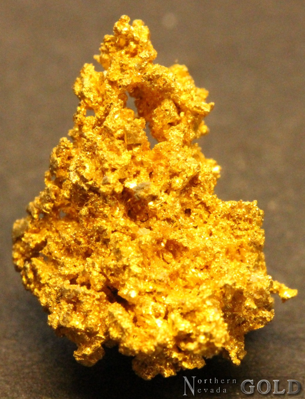 Splendid specimen of crystalline Gold. Gold exhibits brilliant luster, and a lovely orangish-yellow color. Tightly intergrown, weakly crystallized, reticulated mass of Gold structures. Trace % interstitial Quartz. Weighs 2.1 Grams.