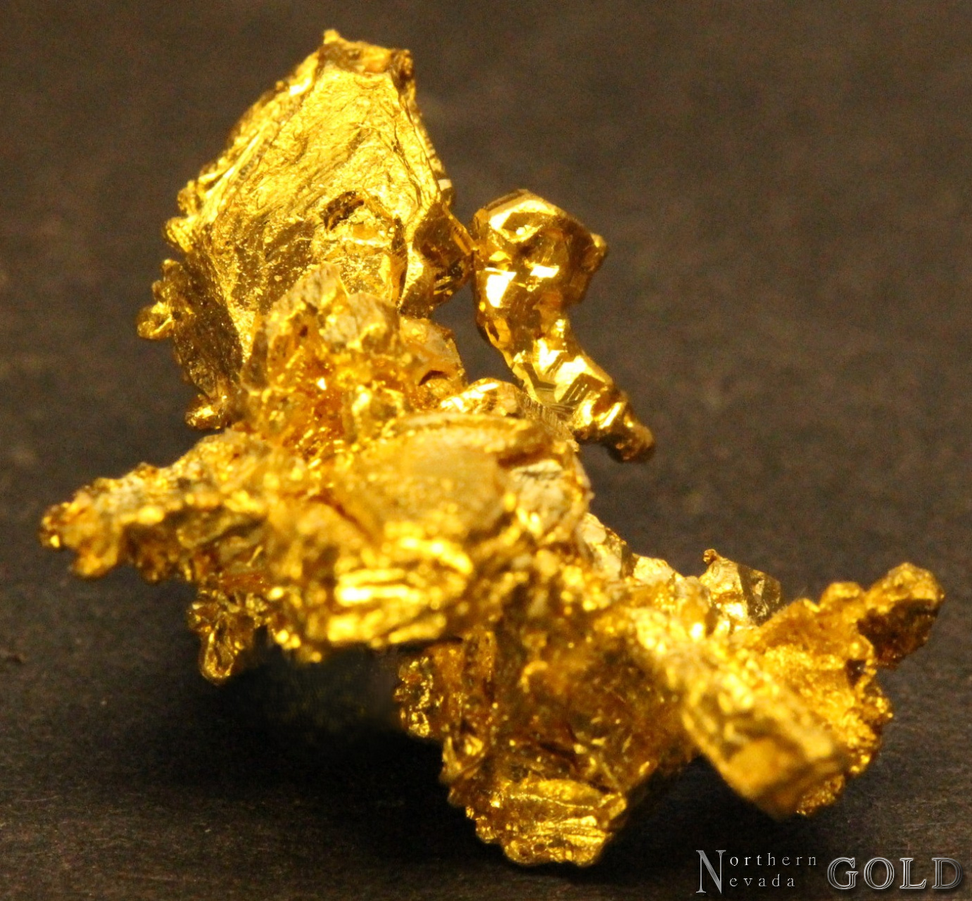 A Splendid, crystallized Gold specimen from the famous Eagles Nest mine, Michigan Bluff Mining District, in Placer Co. California. The specimen exhibits brilliant luster, and rich, buttery-yellow color.  The Gold forms brilliant, mirror-like, flattened octahedrons, and numerous raised octahedral crystals. Weighs 3.4 Grams