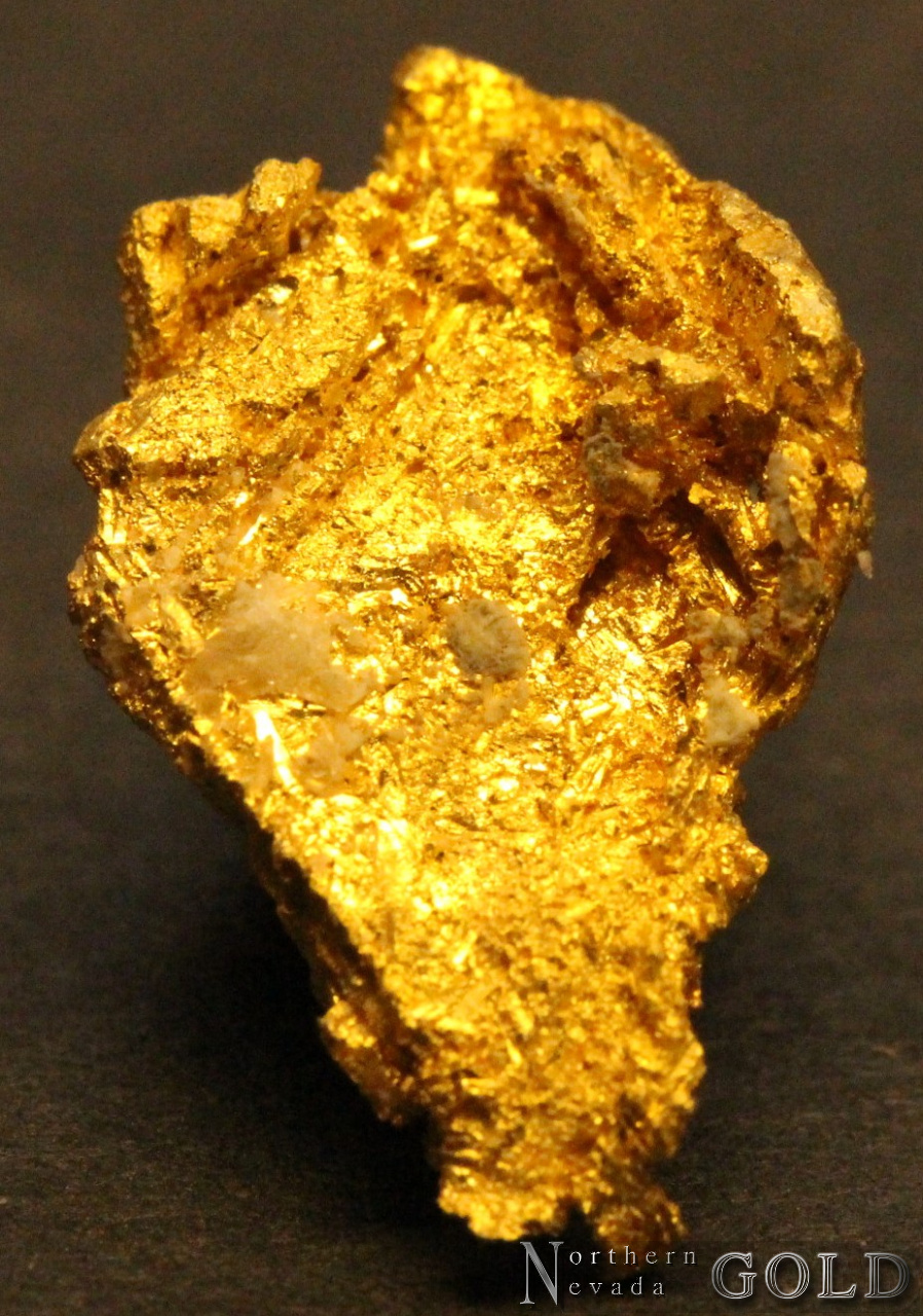 Splendid specimen of Gold from the Round Mountain mine. This specimen exhibits brilliant luster and an orangish gold color. The entire specimen is composed of beautiful Gold crystals. Modified, cuboctahedra, and weakly developed, columnar-like Spinel-Law elongated crystals. Trace Quartz matrix. Weighs 2.24 Grams