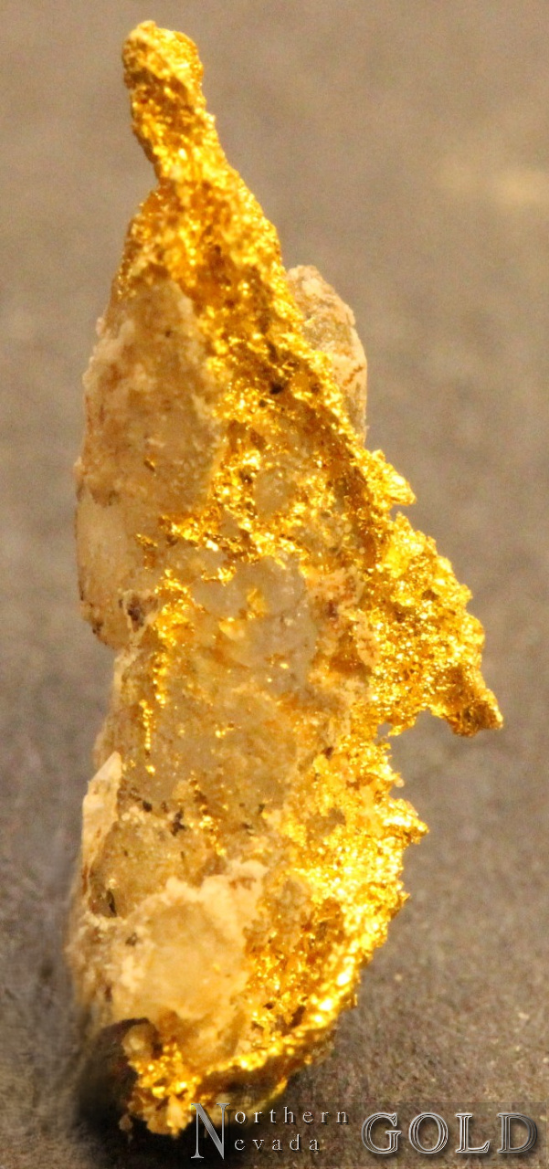 A charming, small, crystalline Gold on white Quartz specimen. Gold shows brilliant luster with strong buttery-yellow color. Found in the Western Sahara, Assa-Zag Province, Morocco. Weighs .35 Gram.