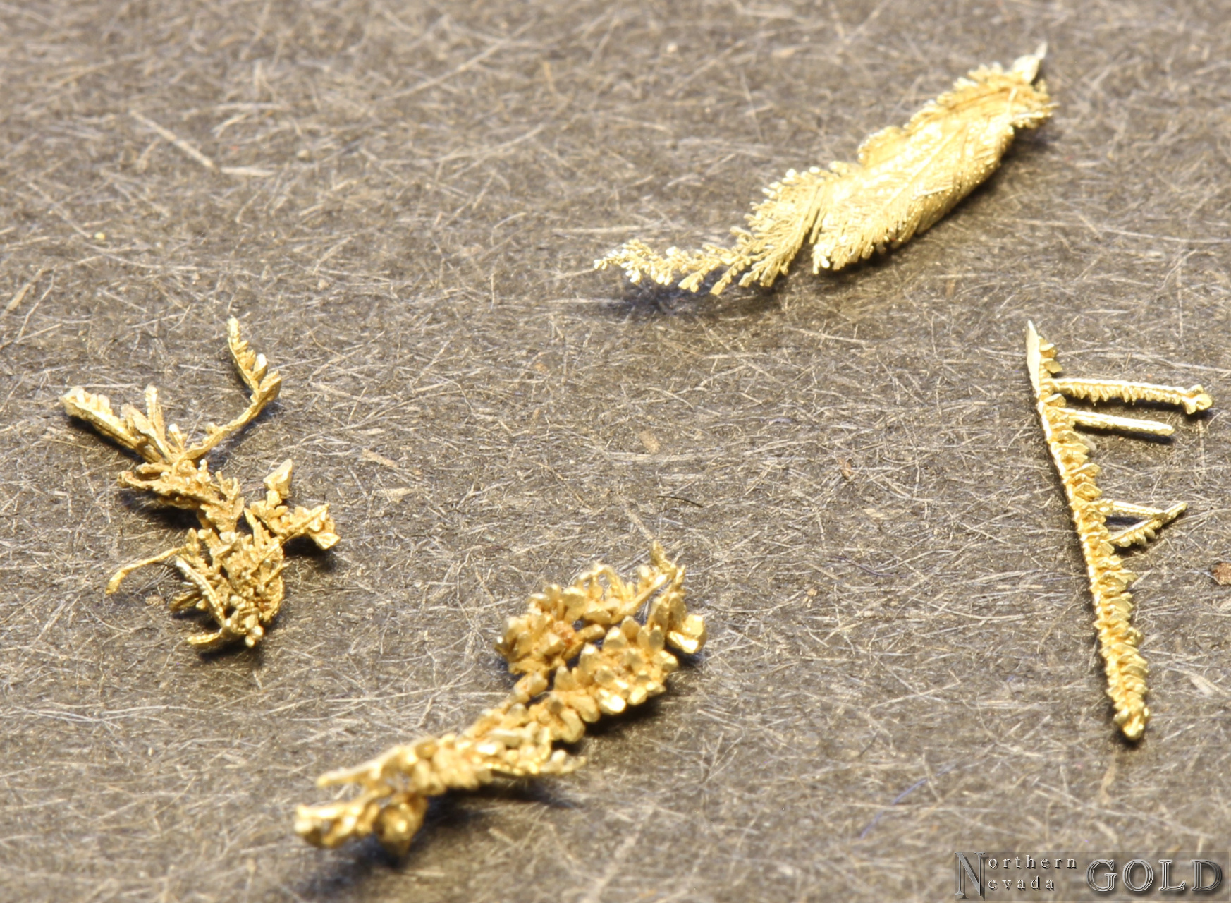 MICRO MOUNT: Intricate and exquisite crystallized Gold. Very small, but beautiful, dendritic Gold specimens. Shows bright luster, and nice color. Ribbons, wires, and intricate herringbone dendritic crystal development. Tiny octahedral crystals are observed on the specimens as well as on the terminations of some of the herringbone growths. Found in the Jumbo Mine area of the Manhattan Mining District, NV. Weighs approx. 2 grains