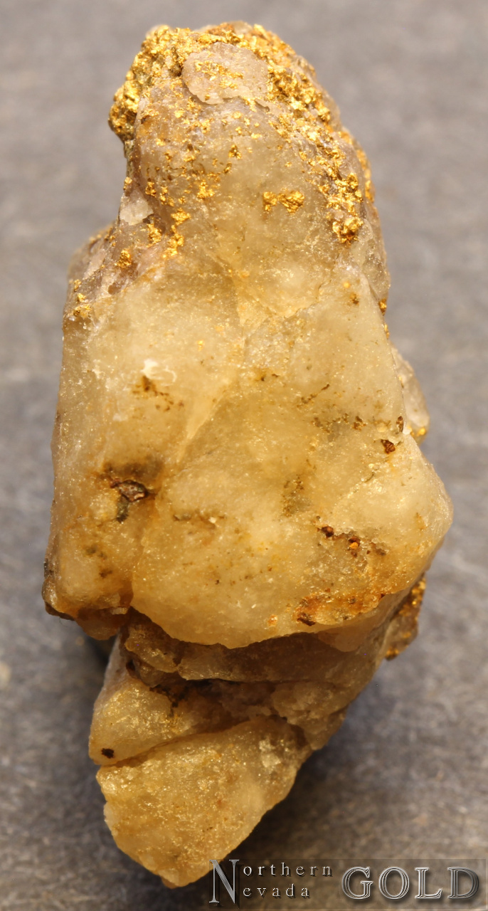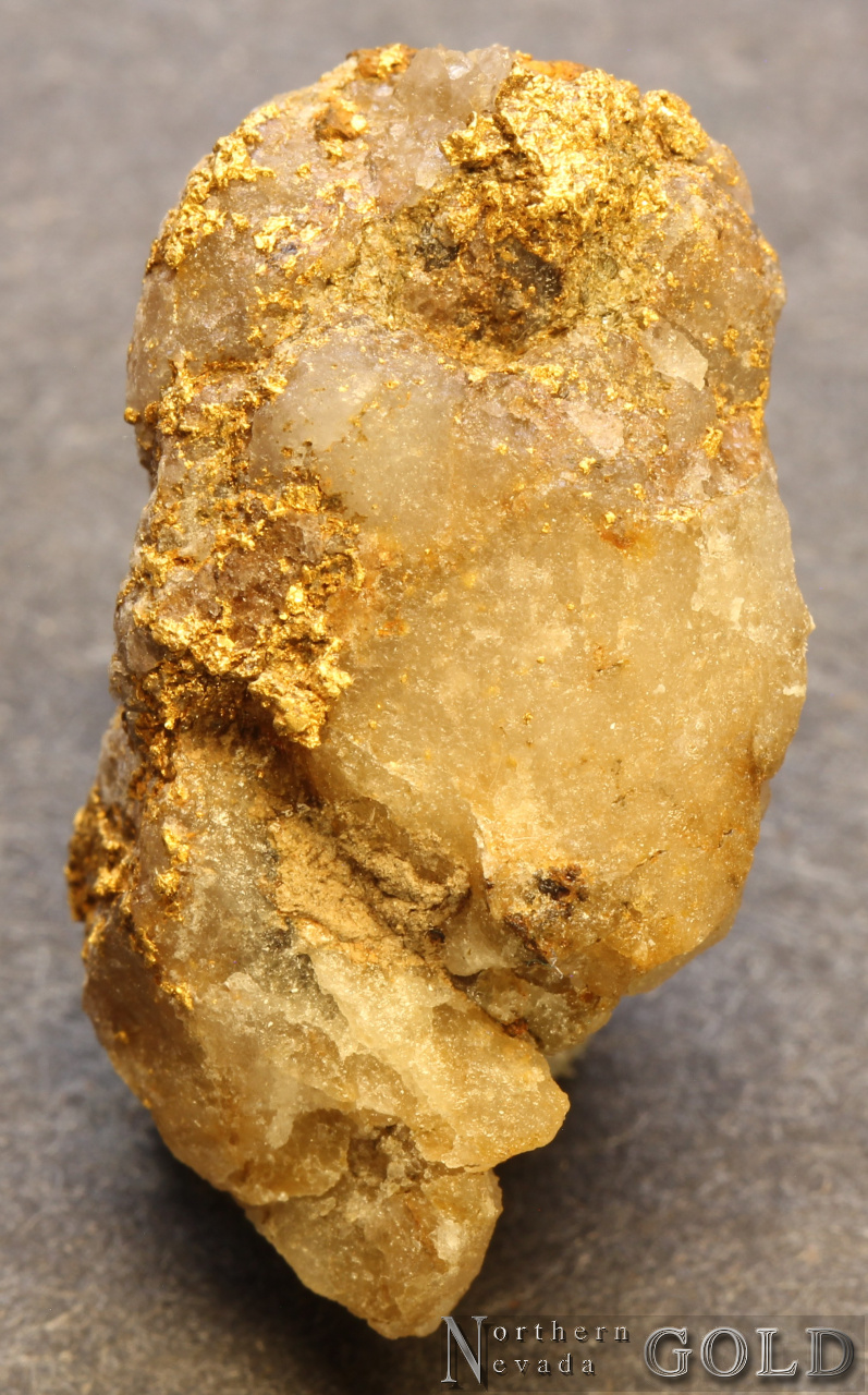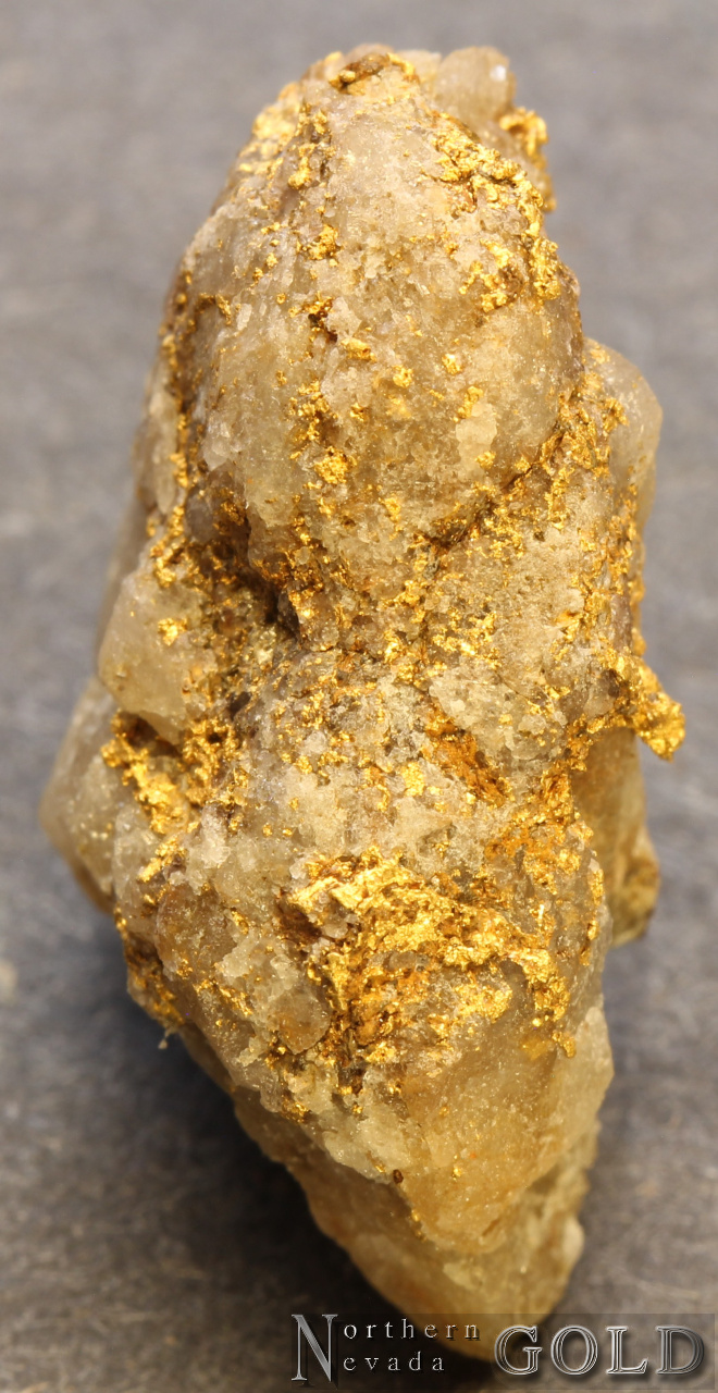 An alluvial Gold specimen. Shows wear on a crystallized Quartz-Gold specimen that was in a placer environment. Gold exhibits bright luster, and a brassy-yellow color. Approximately 50% Quartz matrix. Weighs 7.08 Grams