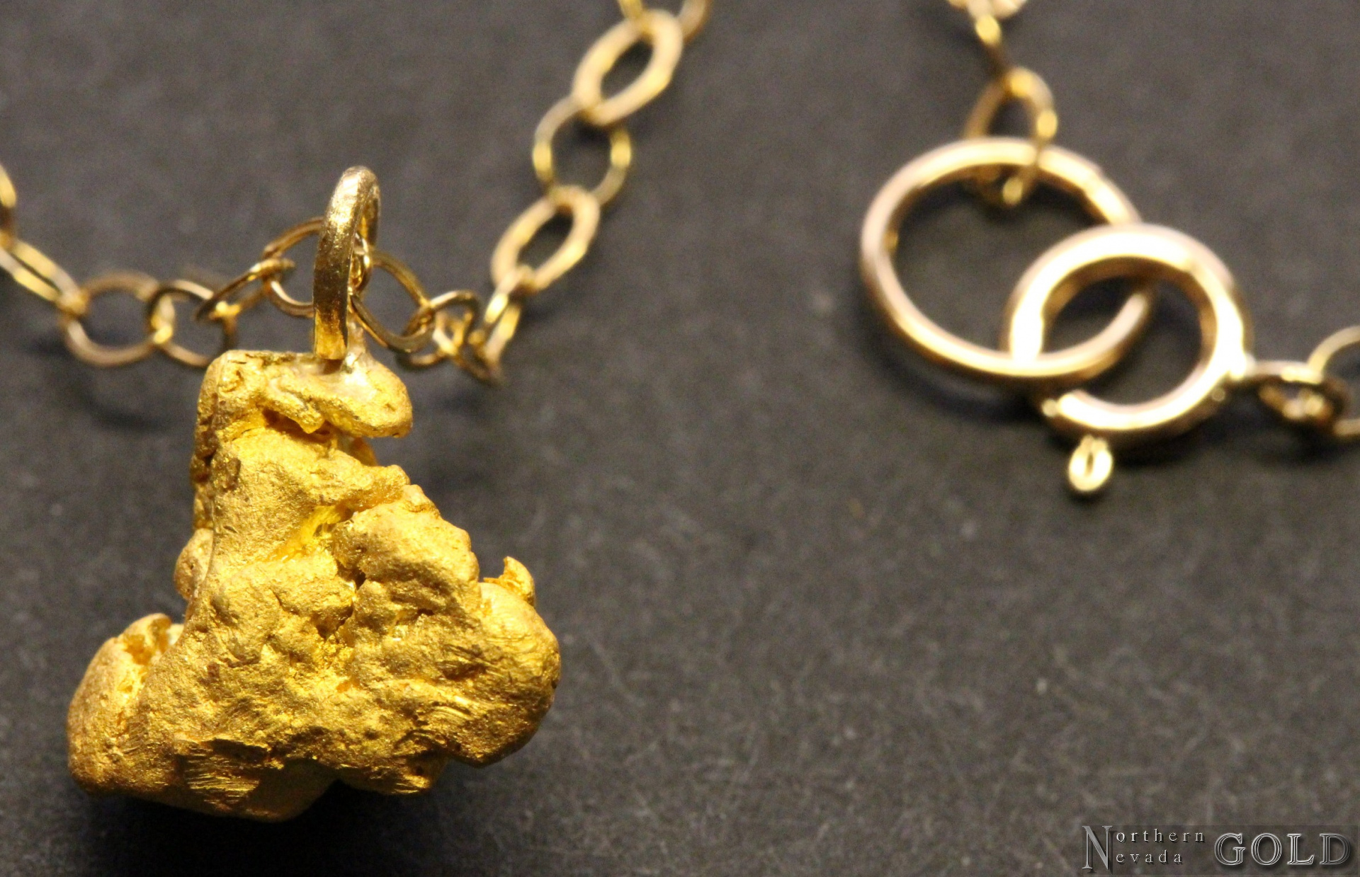 An interesting, small Gold nugget from the Devils Nest  placer that has excellent character and a pleasing shape. Gold shows bright satiny luster and an orangish-yellow color.  Has an 18 inch, 14 karat Gold-filled chain and 14 karat Gold clasps. Found using a Minelab 7000 metal detector.  Weighs .09 ounce.