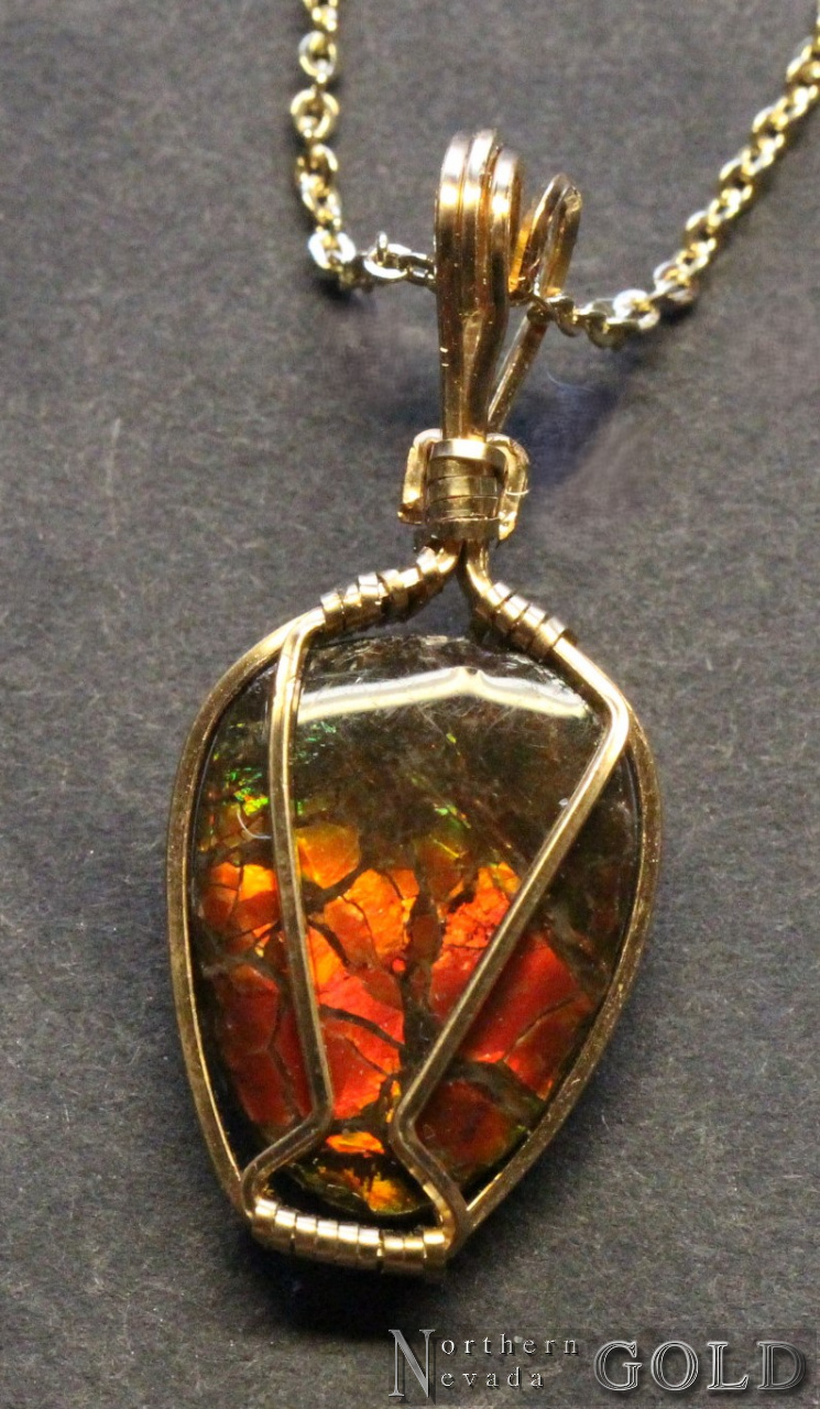 Exquisite 14K Gold filled wrapped Ammolite. This fossil Jewelry comes from ancient Ammonites, found only in Alberta. Shows spectacular orange flashes, stone weighs .74 Grams. Chain is 14K Gold filled.