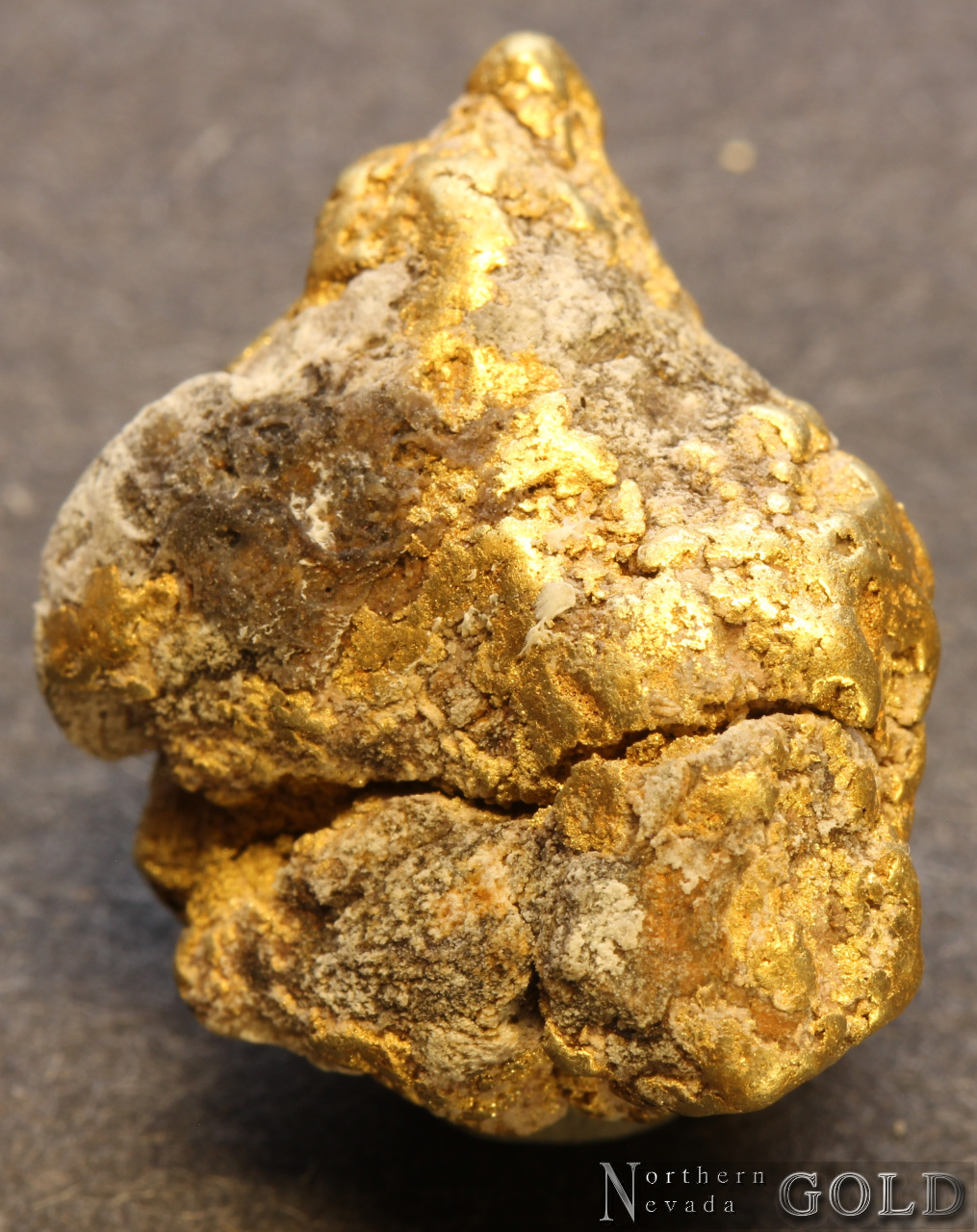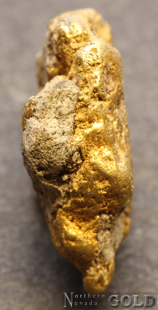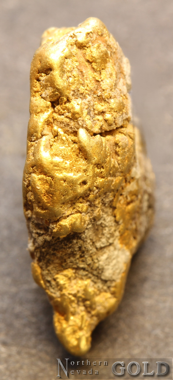 A medium sized Gold nugget from the Manhattan Gulch Placers in Nye Co. NV.  Strong brassy-yellow color and very bright and vibrant luster. Well water-worn. Matrix is a white Quartz. Weighs 8.32 Grams