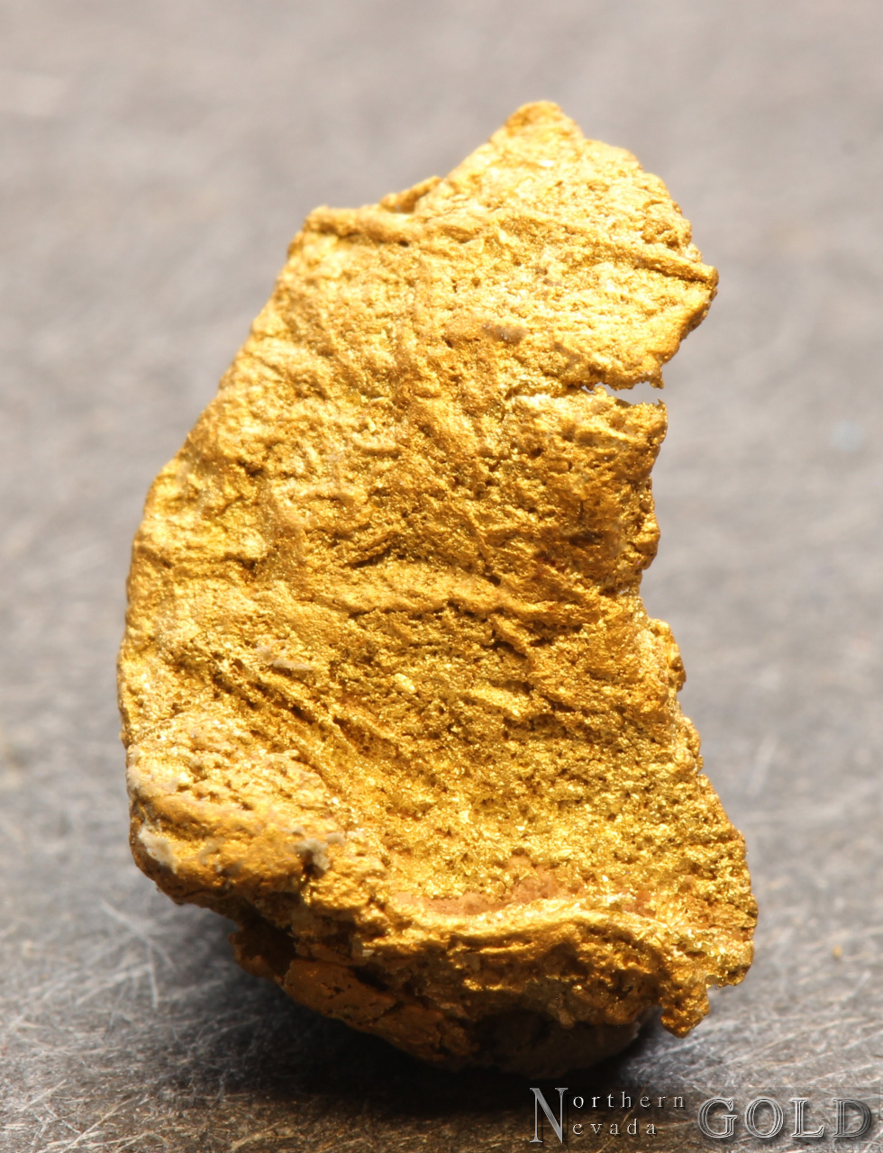 Small, flattened nugget from the Rabbit Hole mining district. Rich honey-yellow color and a satiny luster. Interesting texture. Clean, no Quartz matrix remains. Found using a metal detector. Weighs .62 Gram.