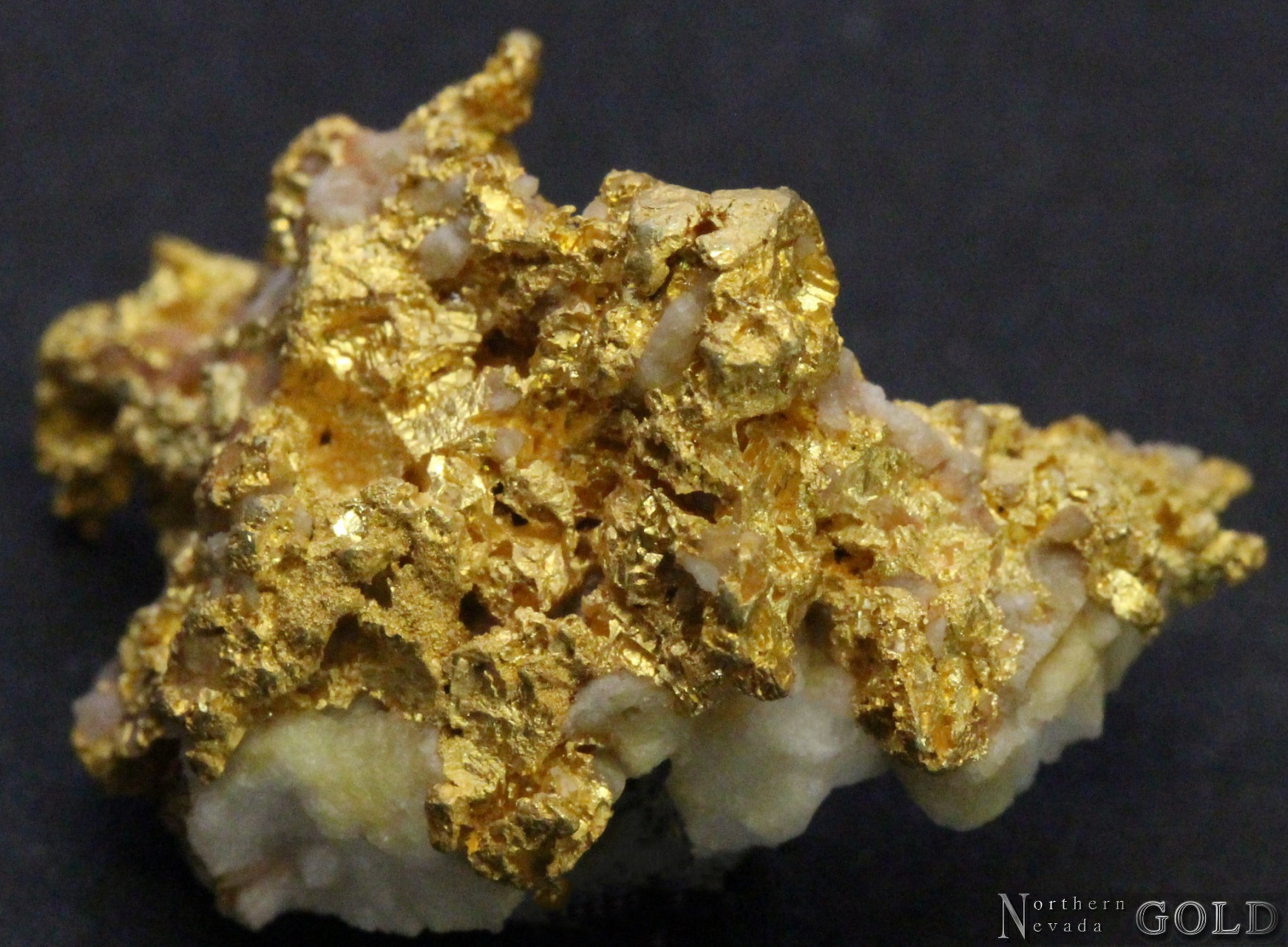 Crystalline Gold in White Quartz. Gold exhibits very bright luster and shows an orangish-yellow color.  Approximately 30% Quartz matrix. Very unusual location. Weighs .23 OZ.