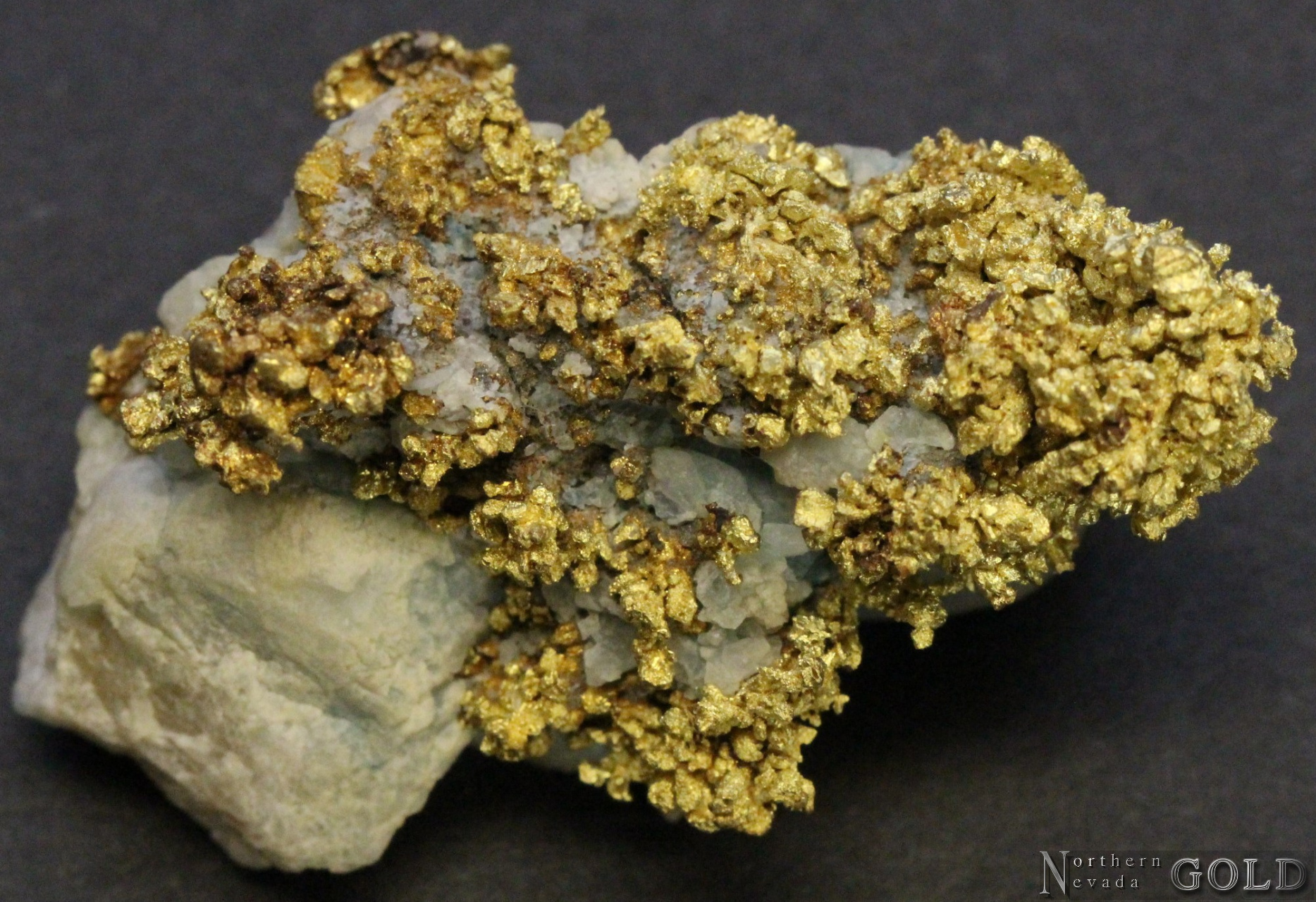 A unique crystallized Gold specimen! Complex, coliform-like Gold crystal development on white bull Quartz. Gold exhibits soft luster, and a greenish tint. Moderate crystal development with occasional octahedron terminations. Quite unusual. Weighs 27.8 Grams