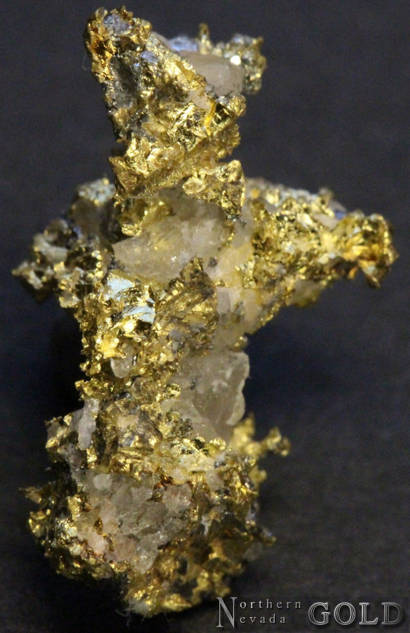 An unusual specimen of Crystalline Gold with a few % Petzite, (Ag3 Au Te2)  Gold exhibits brilliant luster, and a brassy color. The Petzite shows as bright, blueish grey patches on the Gold. Few % clear Quartz matrix.  Obscure location in the Californian Mother Lode.
