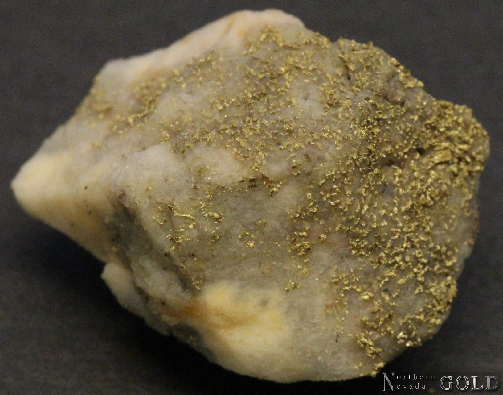 Gold specimen (var. Electrum) from the Seven Troughs mining district. Gold occurs as blades, rods, grains and leaves in a dense Quartz matrix. Gold shows a subdued luster and a lemony yellow color.  A specific gravity determination indicates 2 Grams of Au. Specimen has been treated with mineral oil to enhance the contrast with Gold and Quartz.  Weighs 8.3 Grams