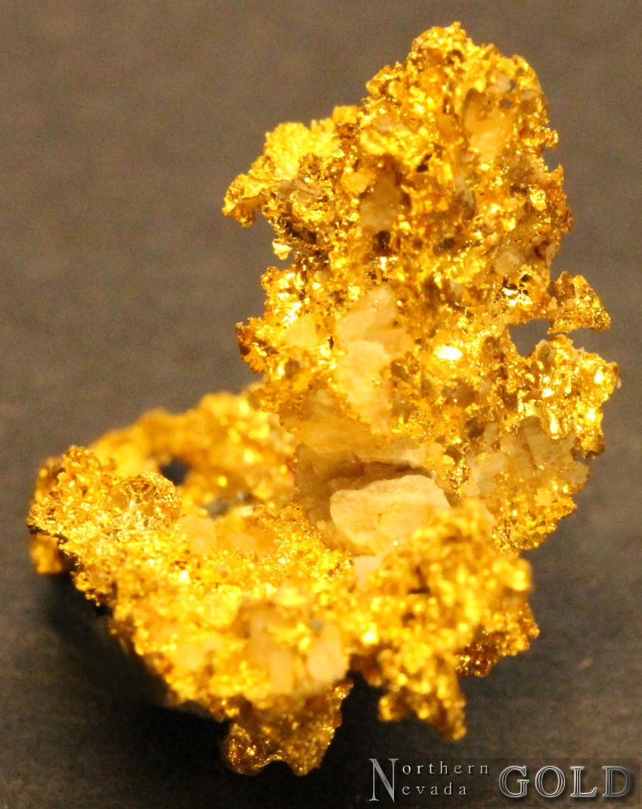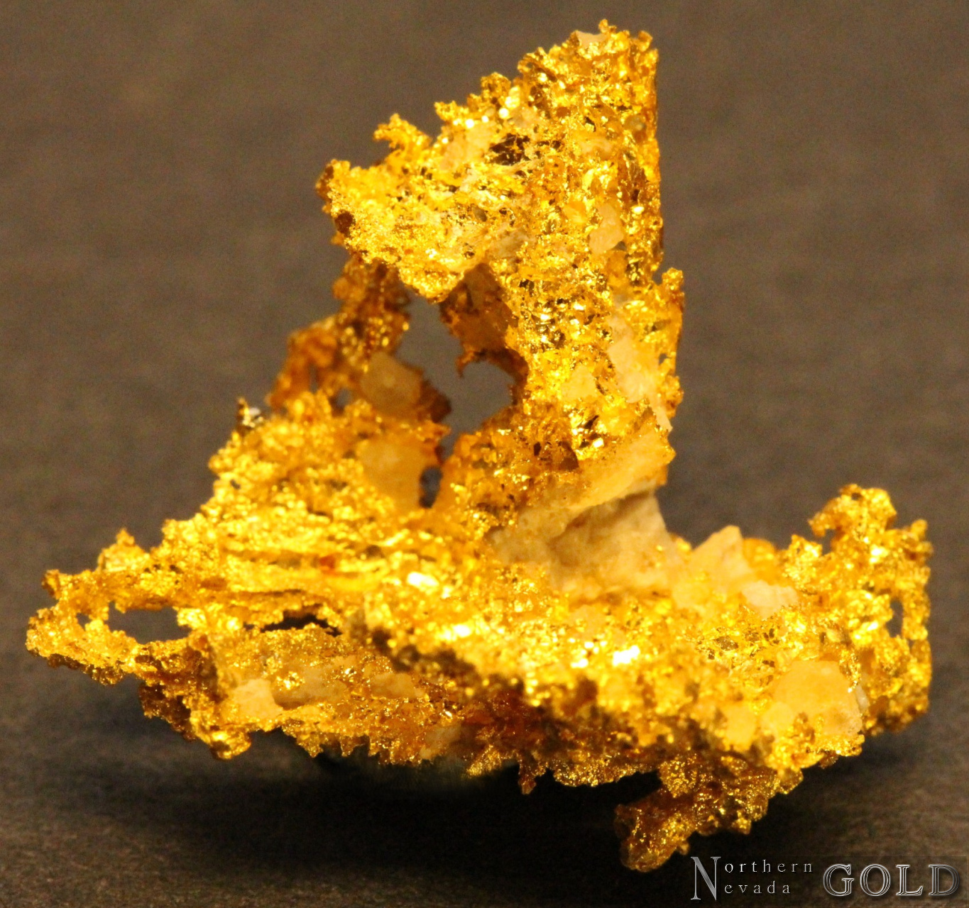 A stunning, crystalline Gold specimen from the Round Mountain Mine in the Round Mountain Mining District.  Arborescent Gold shows brilliant luster and a nice deep orangish- yellow color. Skeletal texture. A few % Quartz matrix remains. Weighs 3.7 Grams