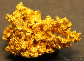 Splendid specimen of crystalline Gold. Gold exhibits brilliant luster, and a lovely orangish-yellow color. Tightly intergrown, weakly crystallized, reticulated mass of Gold structures. Trace % interstitial Quartz. Weighs 2.1 Grams.