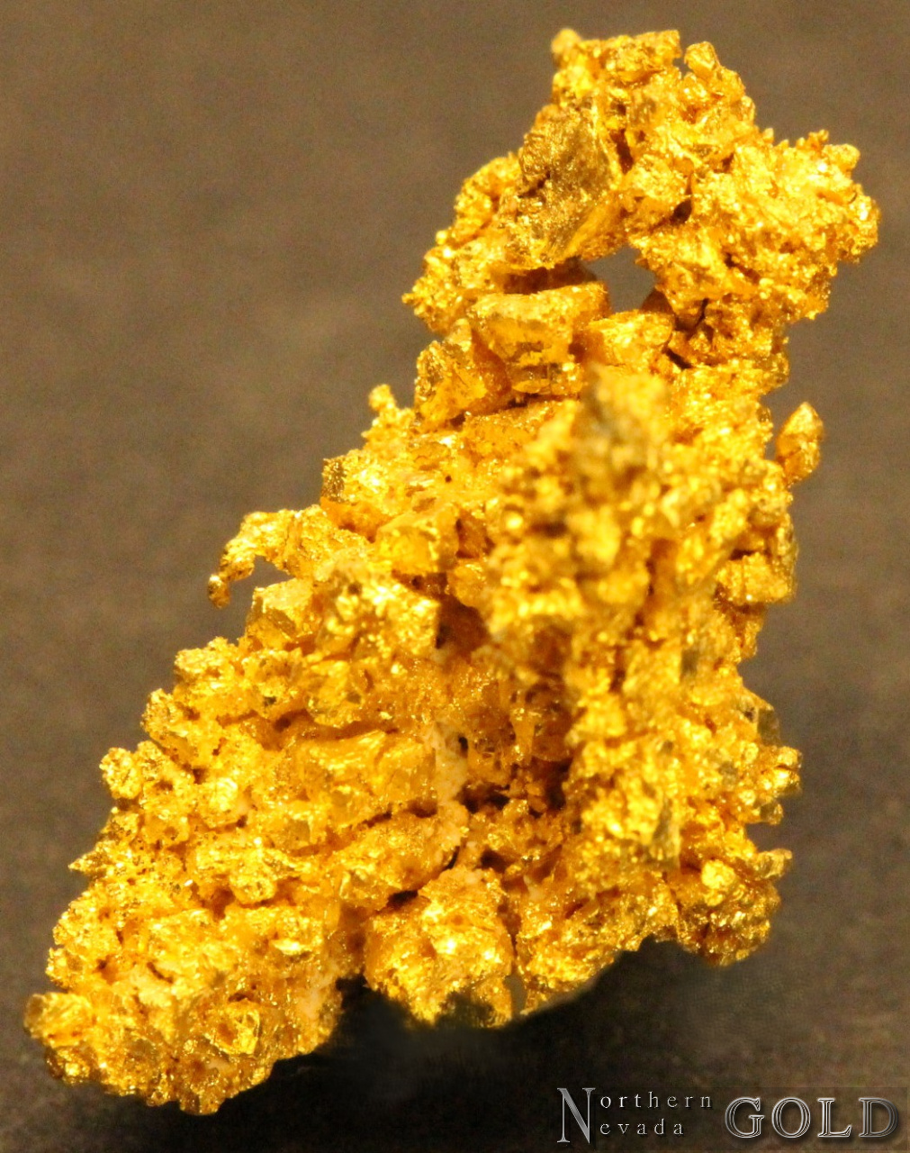 DAZZLING!!  Crystallized Gold. Beautiful specimen of Gold from the Round Mountain mine. This specimen exhibits brilliant luster and a nice orangish gold color. The entire specimen is composed of beautiful Gold crystals. Modified octahedrons, cubes, and cuboctahedra crystals all are well exhibited. A trace Quartz matrix remains. Weighs 2.64 Grams