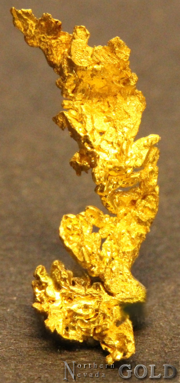 A small, crystallized leaf Gold specimen from the famous Eagles Nest mine, Michigan Bluff Mining District, in Placer Co. California. The specimen exhibits bright luster, and a brassy color.  Interesting character. No Quartz matrix remains. Weighs .28 Gram.