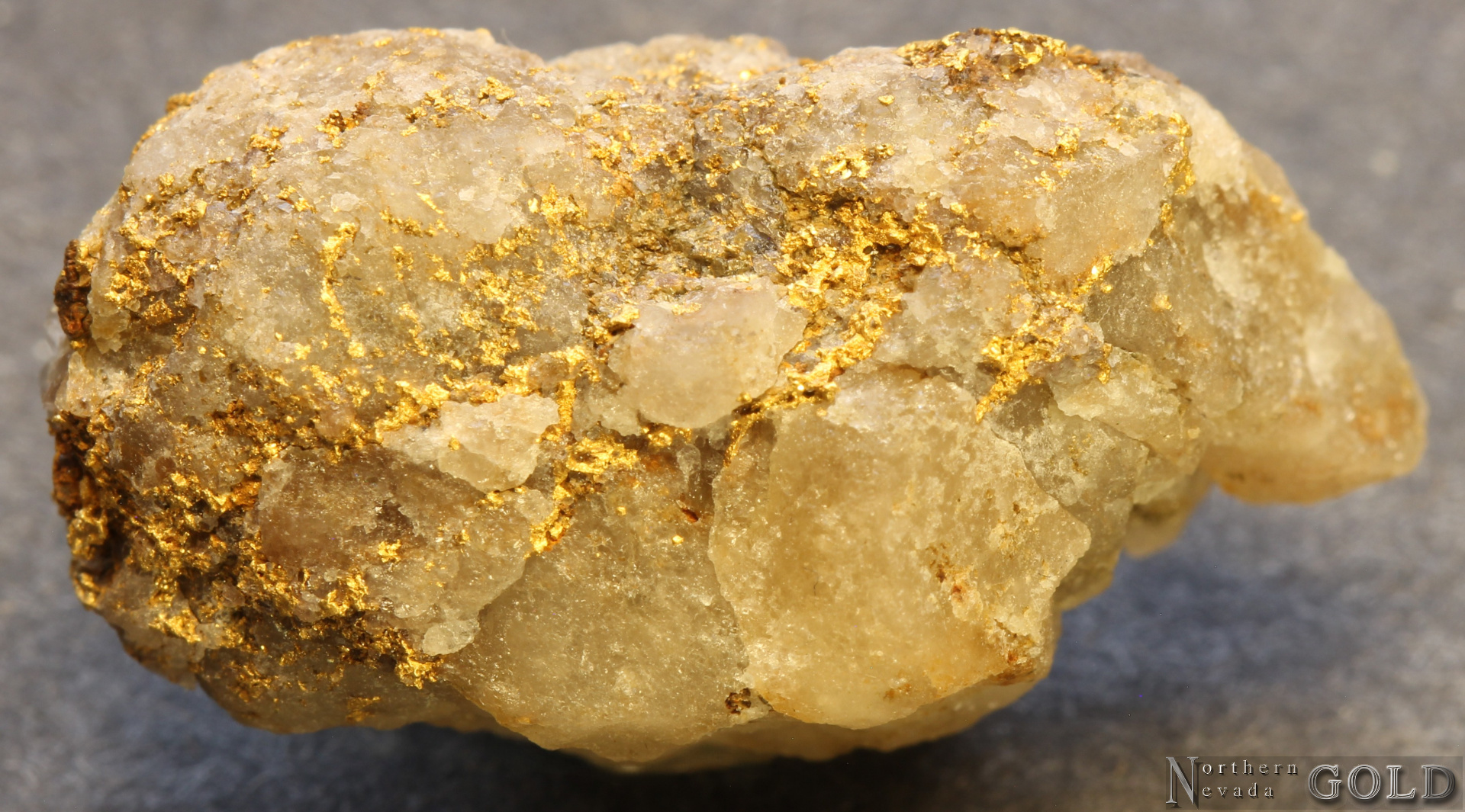 An alluvial Gold specimen. Shows wear on a crystallized Quartz-Gold specimen that was in a placer environment. Gold exhibits bright luster, and a brassy-yellow color. Approximately 50% Quartz matrix. Weighs 7.08 Grams